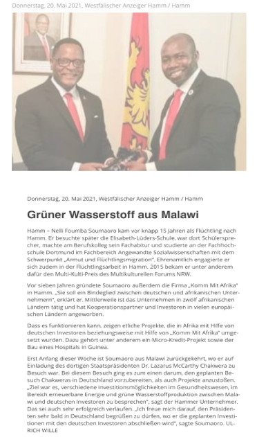 Ich freue mich, dass wir gemeinsam mit dem Präsidenten die ersten Schritte für die Entwicklung des Handels mit grünem Wasserstoff nach Europa, insbesondere nach Hamm, wo ich lebe und auch eine enorme Nachfrage sehe, legen könnten. Ich bedanke mich für die große Gastfreundschaft des Präsidenten und seiner gesamten Regierungsvertreter und freue mich darauf, den Präsidenten sehr bald in Deutschland oder Malawi wieder begrüßen zu dürfen, wo wir die geplanten Investitionen mit den deutschen Investoren abschließen werden, so Nelli Foumba Soumaoro, Präsident und CEO der ,,Komm Mit Afrika Holding”.
